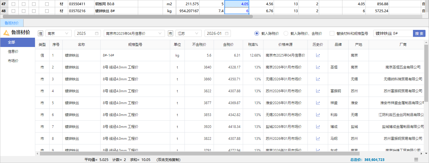 鲁班材价助手涵盖江苏信息价、市场价,支持批量载价、单条查询,也支持调用Excel和外工程价格,高效完成载价。