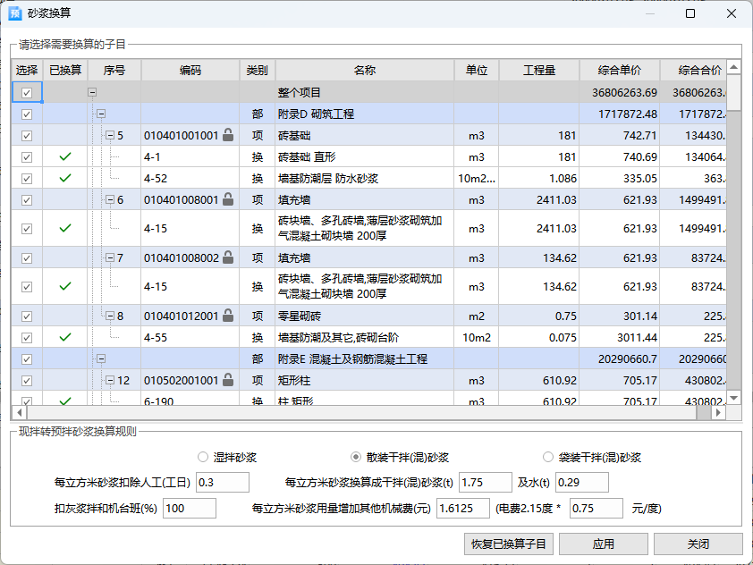 软件内置砂浆 / 砼等级换算、安装费用/超高降效费计取、钢筋模板提取、刷油保温、泵车费扣减、大型机械进出场费等实用功能,贴合各专业计价需求。