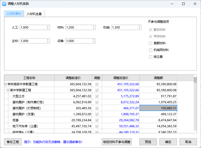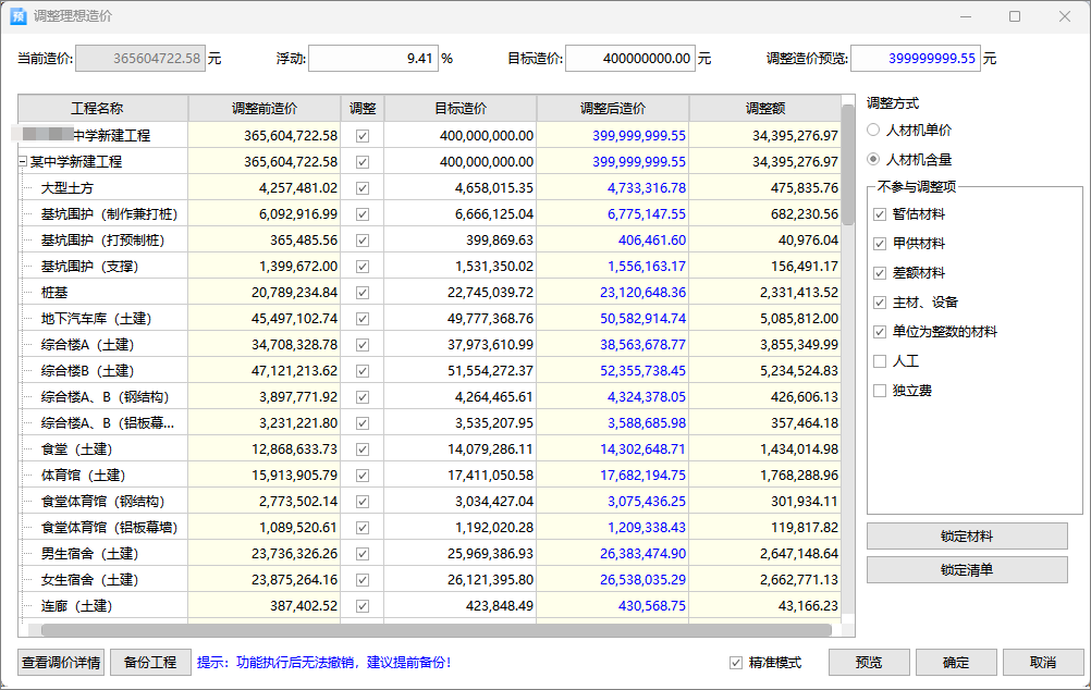 软件支持批量调整人材机单价、含量、系数等,亦可直接输入目标造价灵活调价。